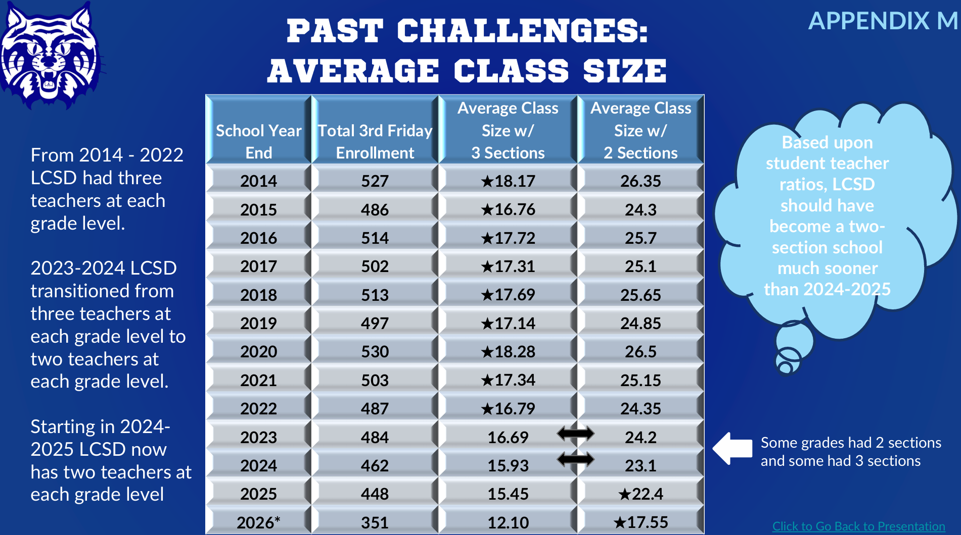 This chart shows that based on enrollment trends, Lake Country School should have transitioned to a two-section model earlier than it did. Remaining a three-section school longer than enrollment supported resulted in higher staffing costs that compounded over time.